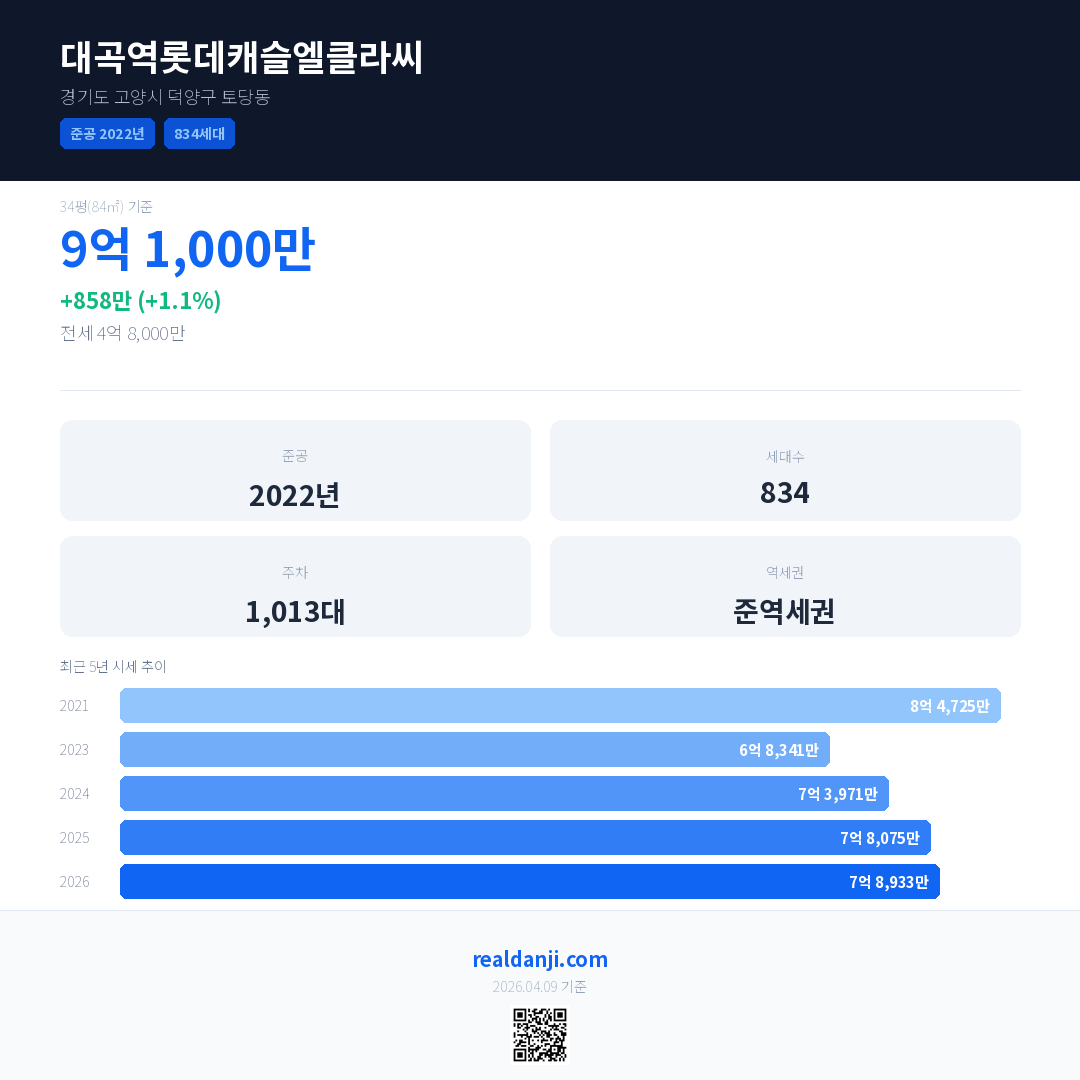 대곡역롯데캐슬엘클라씨 국민평형 기준 2026년 평균 거래가는 7억 8,933만으로, 전년 대비 1.1% 상승 했습니다.