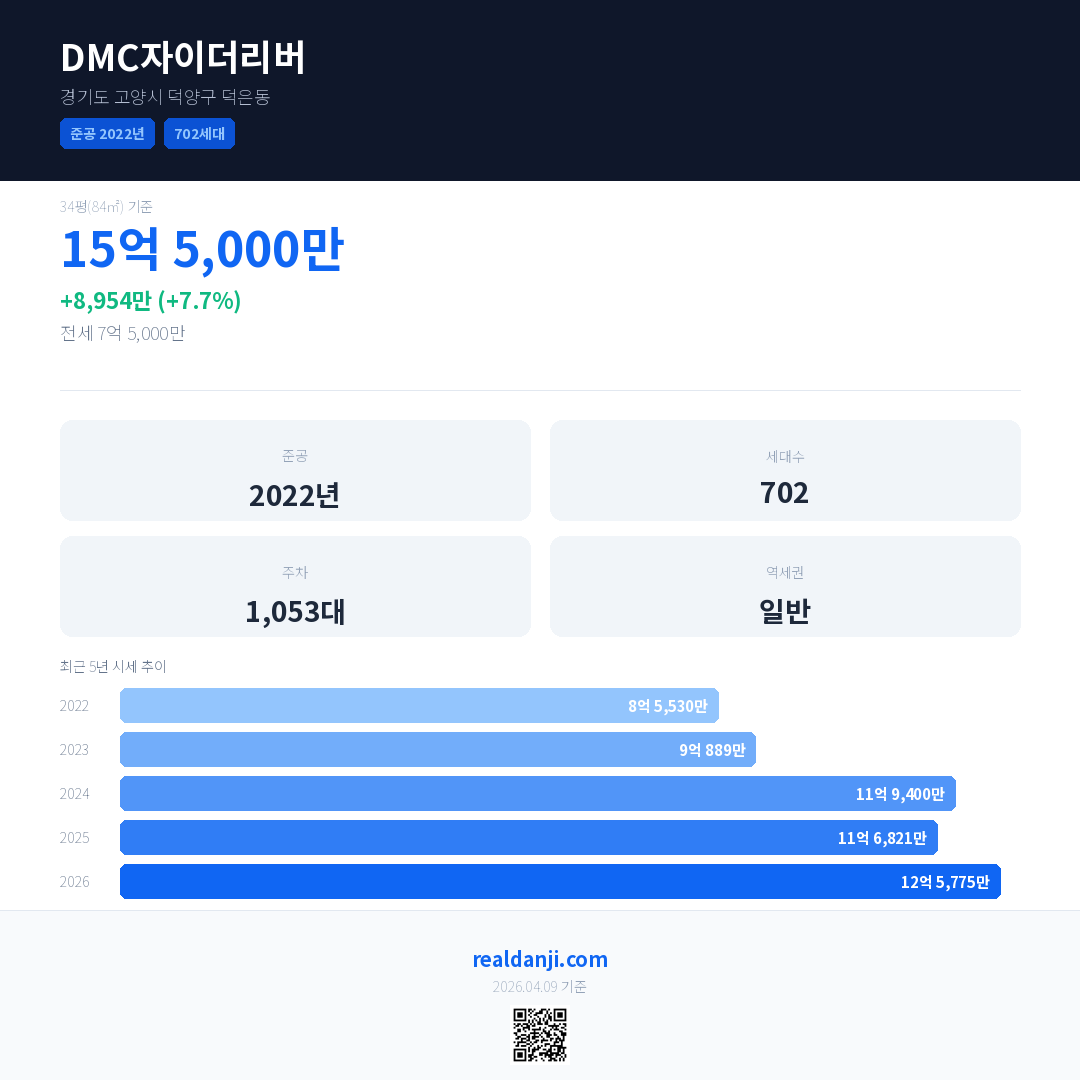 DMC자이더리버 국민평형 기준 2026년 평균 거래가는 12억 5,775만으로, 전년 대비 7.7% 상승 했습니다.