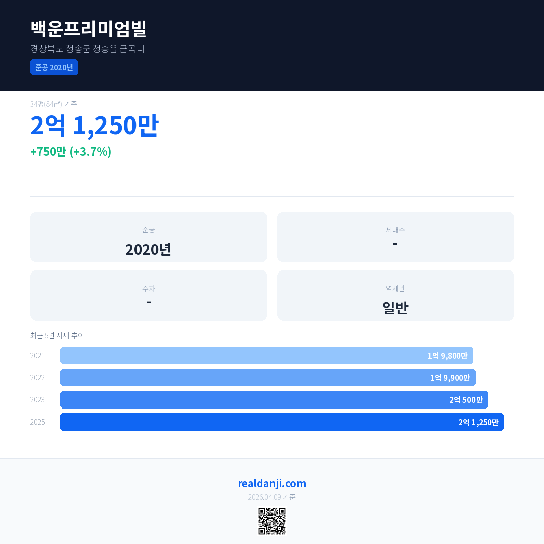 백운프리미엄빌 국민평형 기준 2025년 평균 거래가는 2억 1,250만으로, 전년 대비 3.7% 상승 했습니다.
