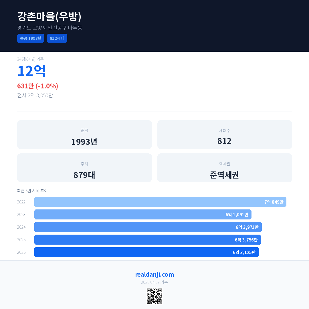 강촌마을(우방) 국민평형 기준 2026년 평균 거래가는 6억 3,125만으로, 전년 대비 1.0% 하락 했습니다.