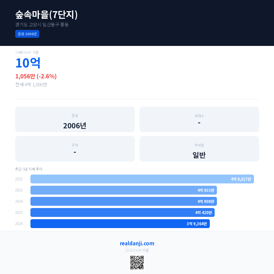 숲속마을(7단지) 국민평형 기준 2026년 평균 거래가는 3억 9,364만으로, 전년 대비 2.6% 하락 했습니다.