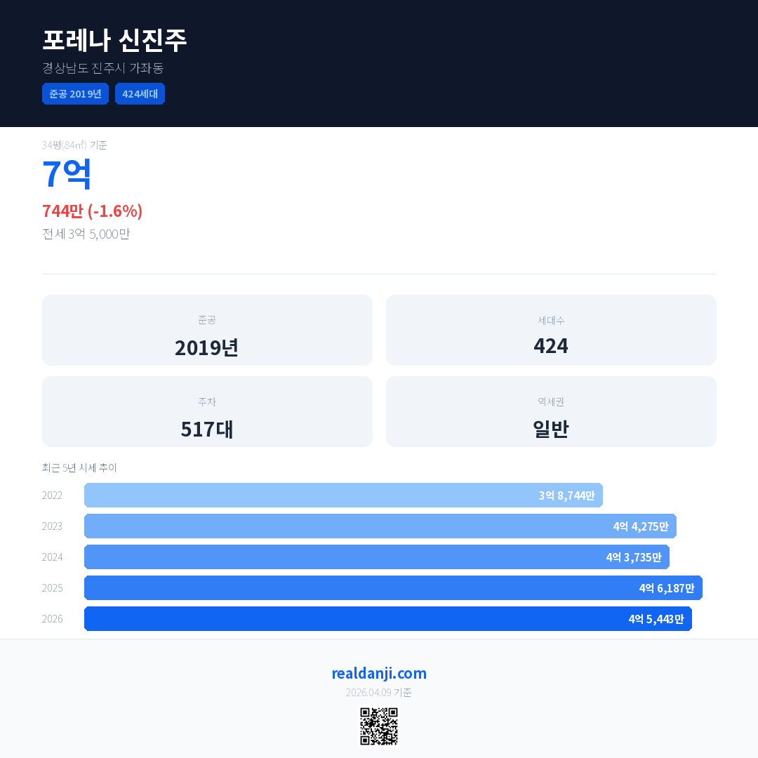 포레나 신진주 국민평형 기준 2026년 평균 거래가는 4억 5,443만으로, 전년 대비 1.6% 하락 했습니다.