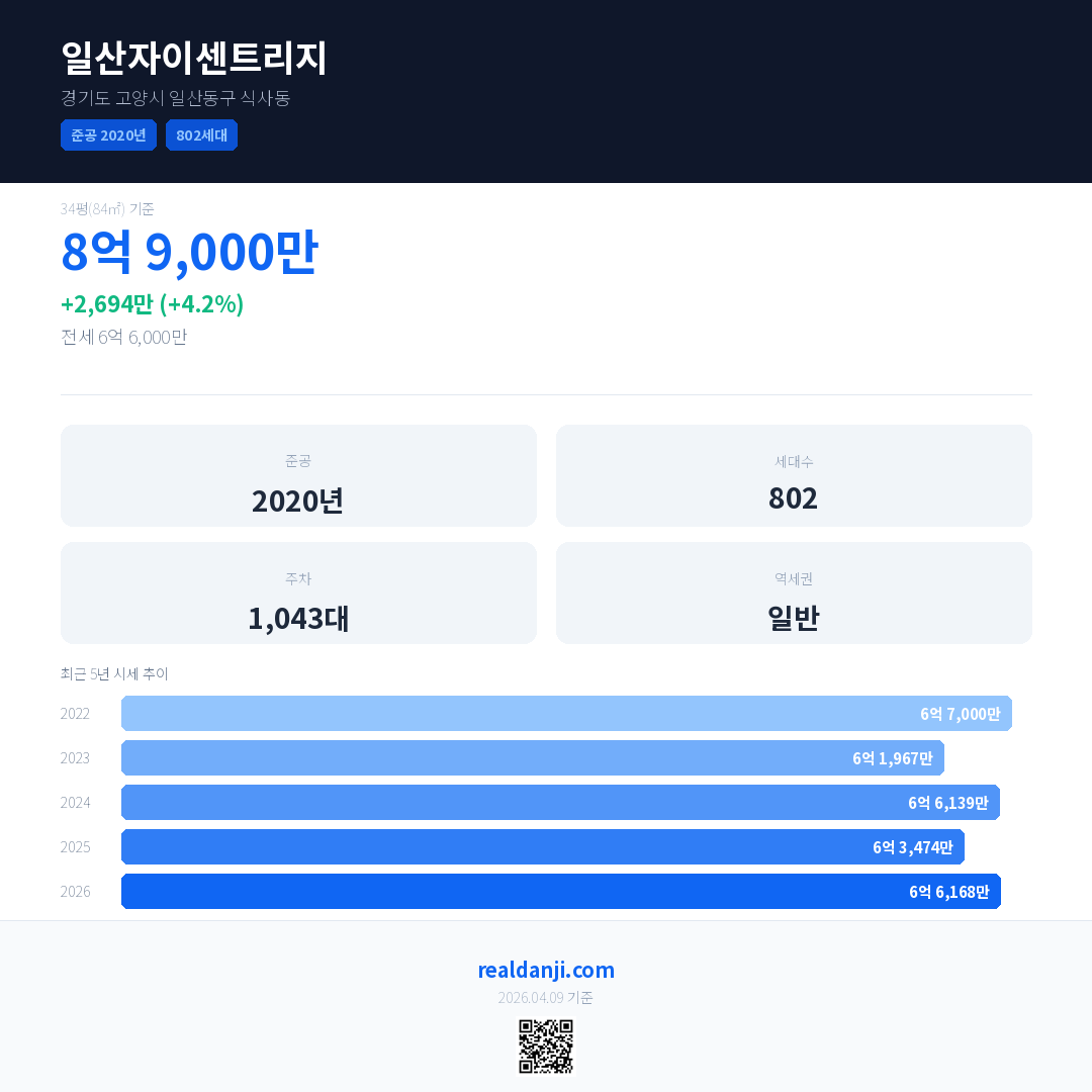 일산자이센트리지 국민평형 기준 2026년 평균 거래가는 6억 6,168만으로, 전년 대비 4.2% 상승 했습니다.