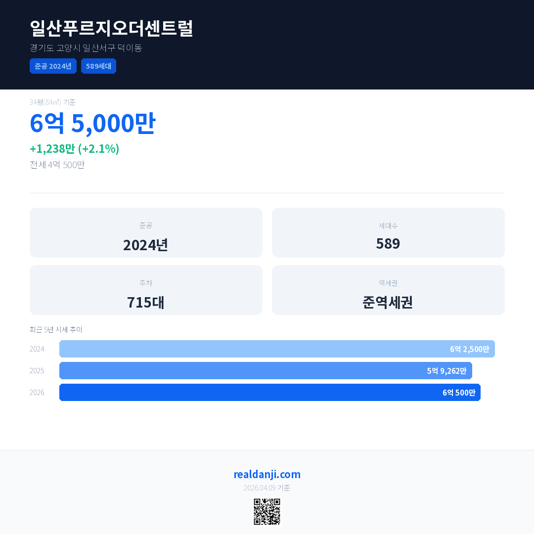 일산푸르지오더센트럴 국민평형 기준 2026년 평균 거래가는 6억 500만으로, 전년 대비 2.1% 상승 했습니다.