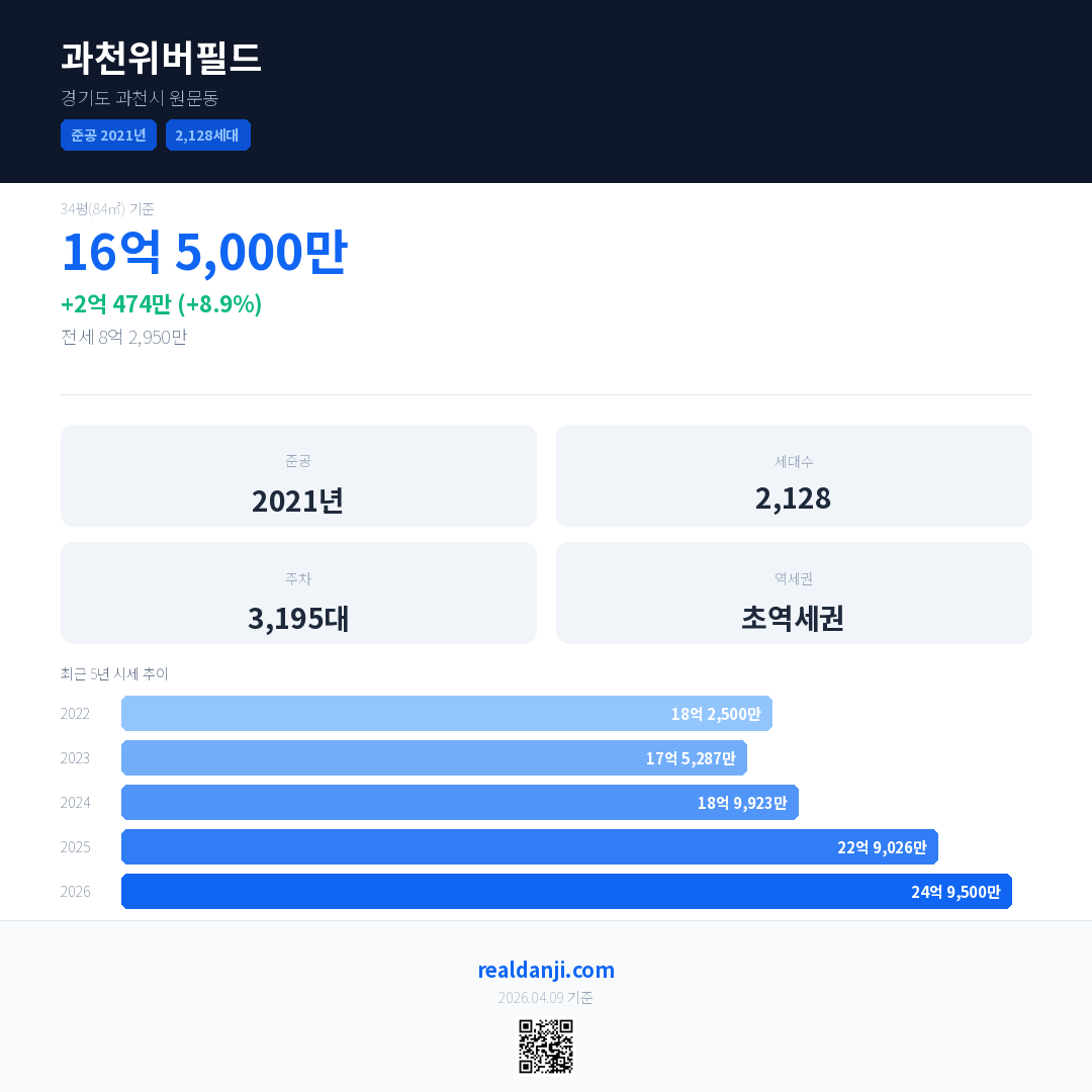 과천위버필드 국민평형 기준 2026년 평균 거래가는 24억 9,500만으로, 전년 대비 8.9% 상승 했습니다.