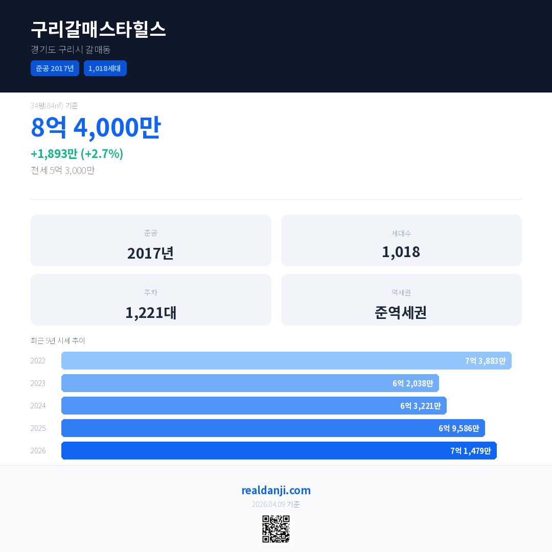 구리갈매스타힐스 국민평형 기준 2026년 평균 거래가는 7억 1,479만으로, 전년 대비 2.7% 상승 했습니다.