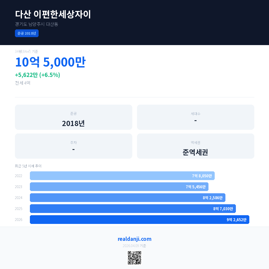다산 이편한세상자이 국민평형 기준 2026년 평균 거래가는 9억 2,652만으로, 전년 대비 6.5% 상승 했습니다.