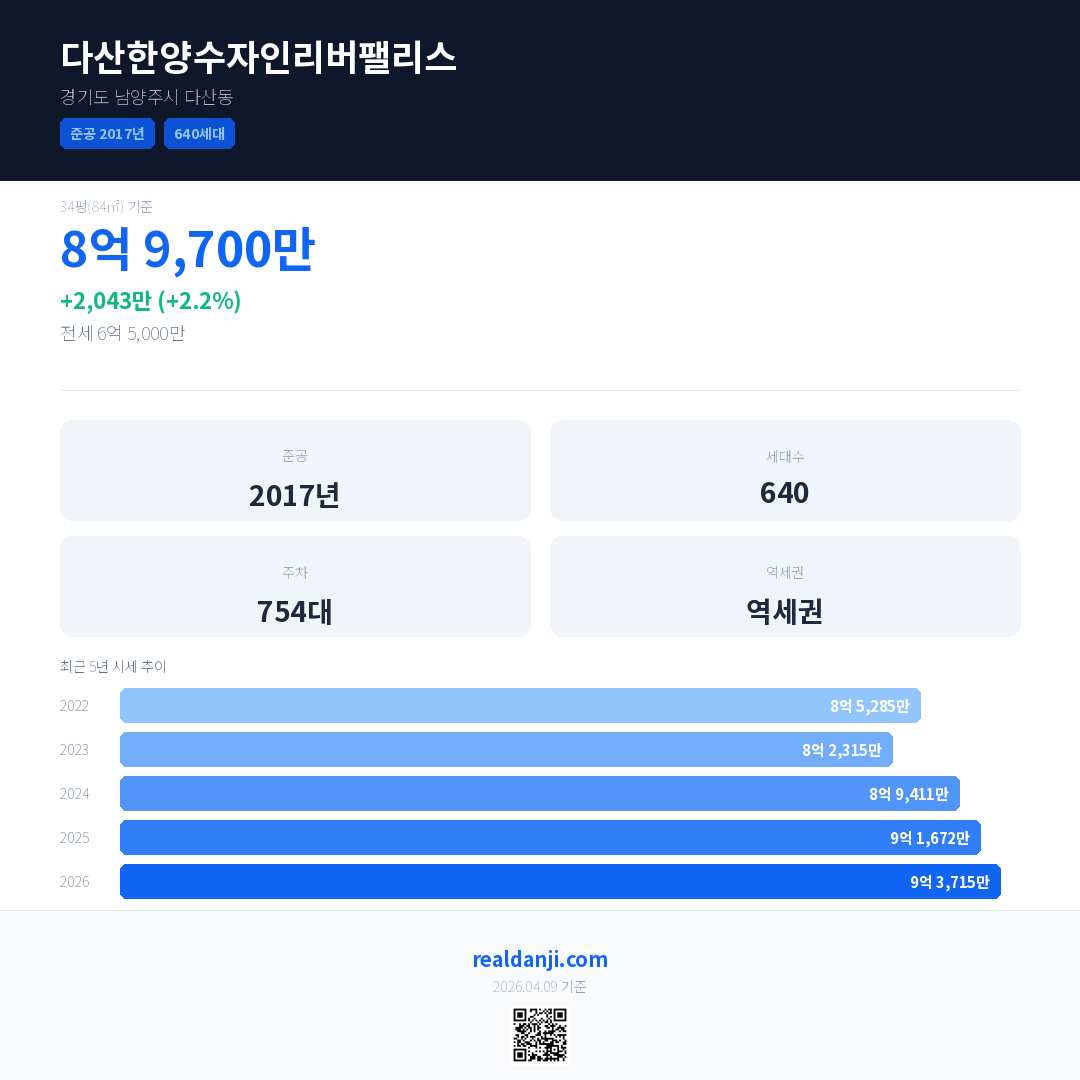 다산한양수자인리버팰리스 국민평형 기준 2026년 평균 거래가는 9억 3,715만으로, 전년 대비 2.2% 상승 했습니다.