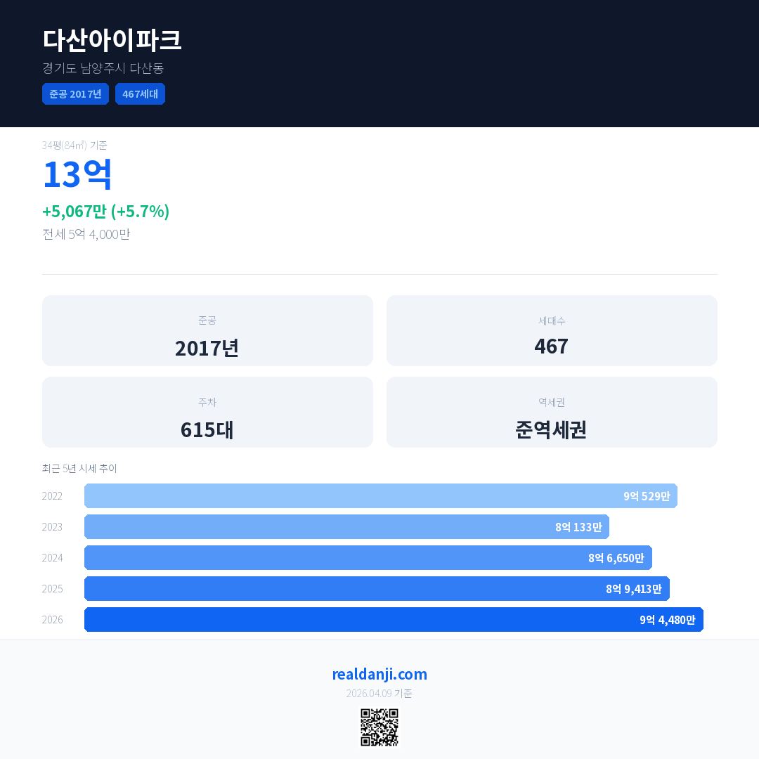 다산아이파크 최근 거래가는 13억입니다. (2026-04)