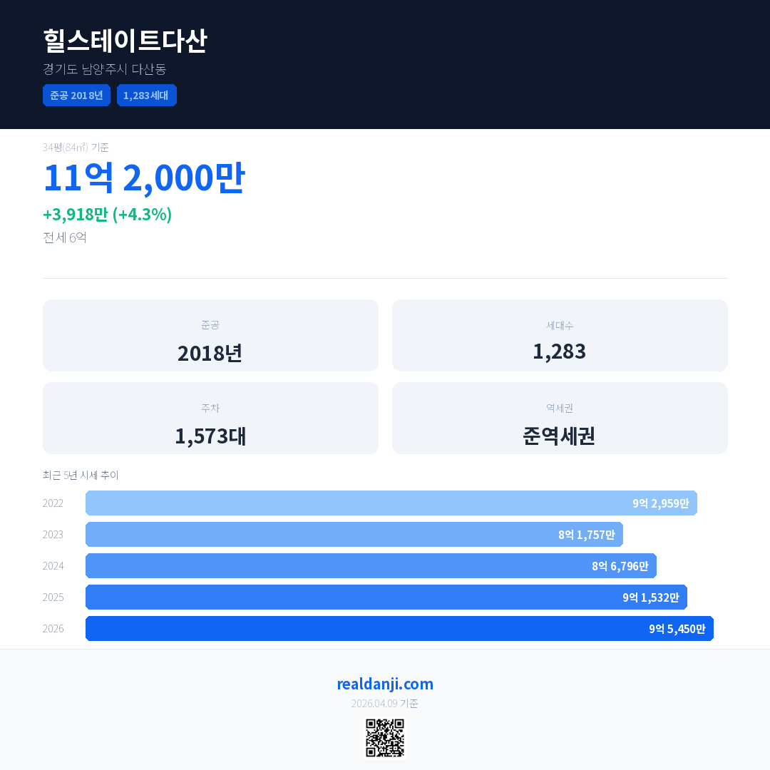 힐스테이트다산 국민평형 기준 2026년 평균 거래가는 9억 5,450만으로, 전년 대비 4.3% 상승 했습니다.