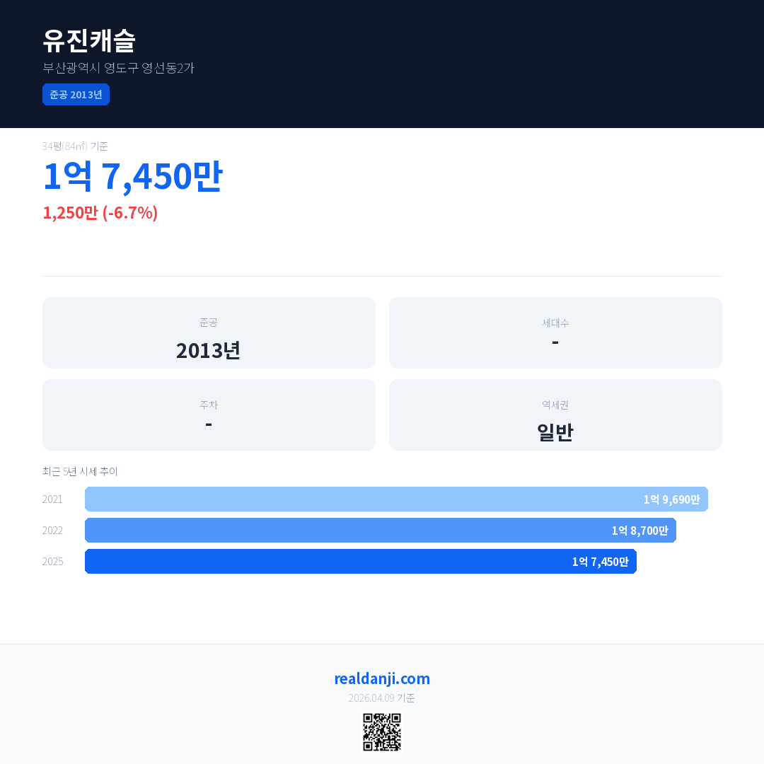 유진캐슬 국민평형 기준 2025년 평균 거래가는 1억 7,450만으로, 전년 대비 6.7% 하락 했습니다.