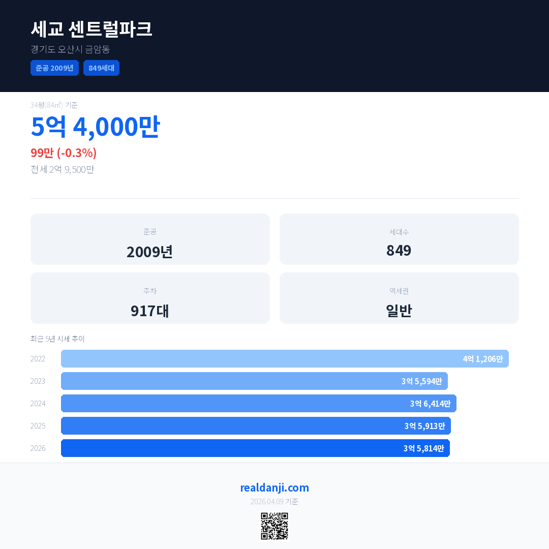 세교 센트럴파크 최근 거래가는 5억 4,000만입니다. (2026-04)