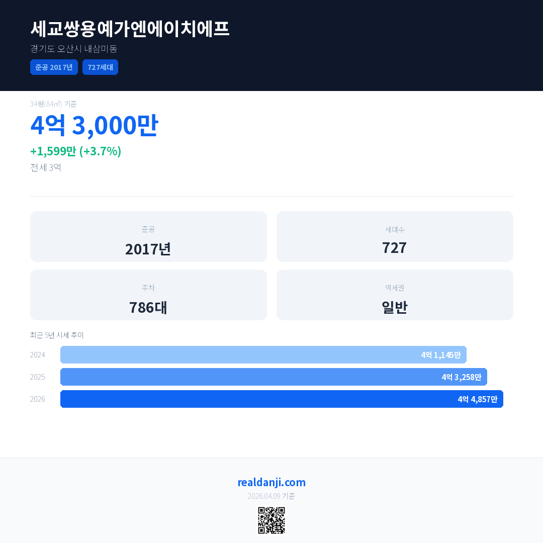 세교쌍용예가엔에이치에프 국민평형 기준 2026년 평균 거래가는 4억 4,857만으로, 전년 대비 3.7% 상승 했습니다.