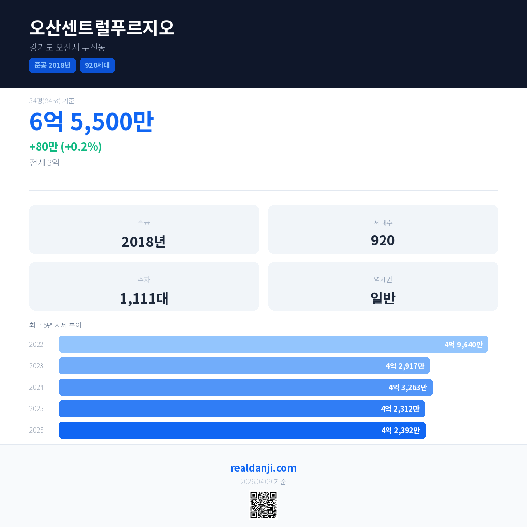 오산센트럴푸르지오 최근 거래가는 6억 5,500만입니다. (2026-04)