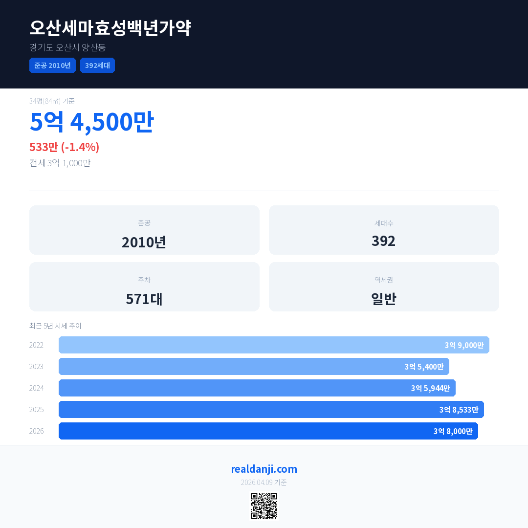 오산세마효성백년가약 최근 거래가는 5억 4,500만입니다. (2026-04)
