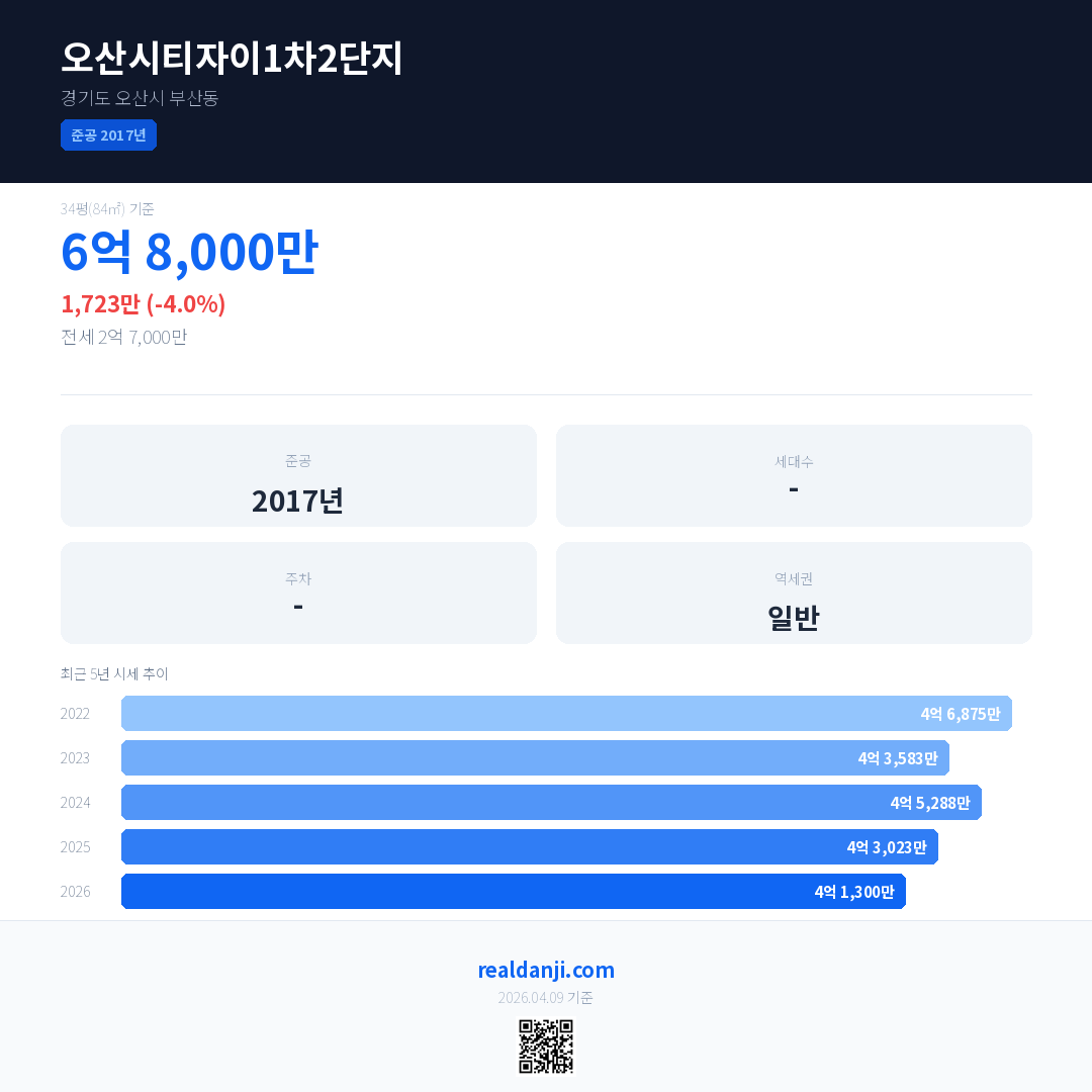 오산시티자이1차2단지 최근 거래가는 6억 8,000만입니다. (2026-03)