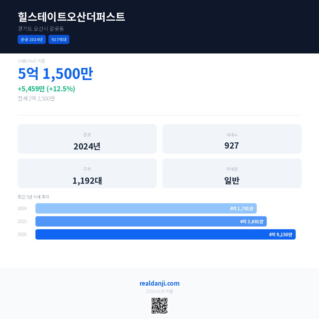 힐스테이트오산더퍼스트 국민평형 기준 2026년 평균 거래가는 4억 9,150만으로, 전년 대비 12.5% 상승 했습니다.
