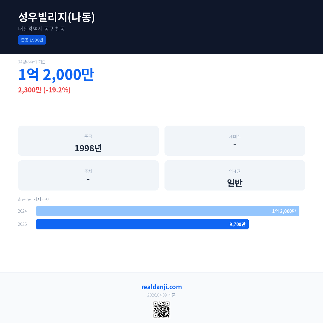 성우빌리지(나동) 국민평형 기준 2025년 평균 거래가는 9,700만으로, 전년 대비 19.2% 하락 했습니다.