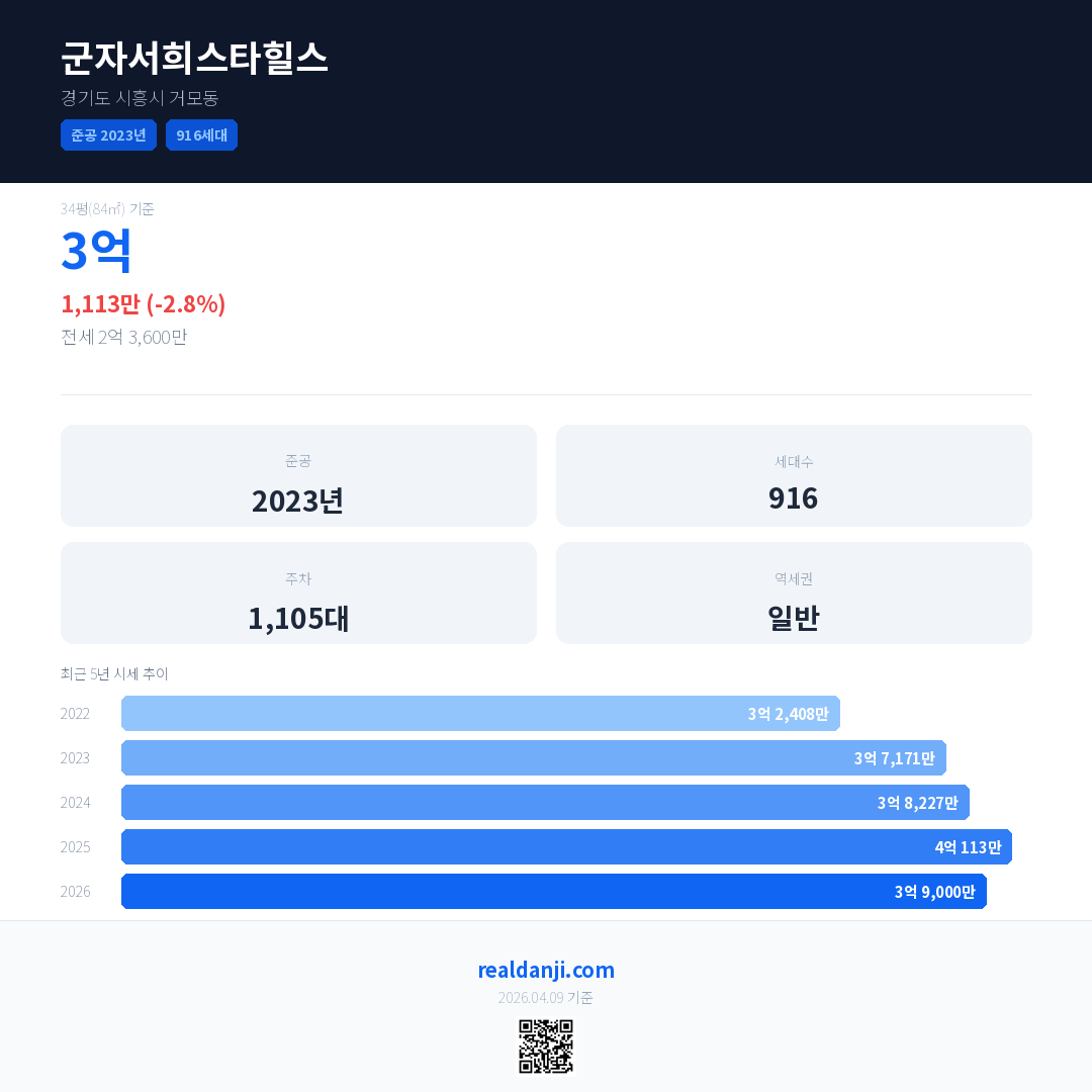 군자서희스타힐스은(는) 2023년에 준공되었으며, 현재 3년차입니다. 총 916세대 규모입니다.