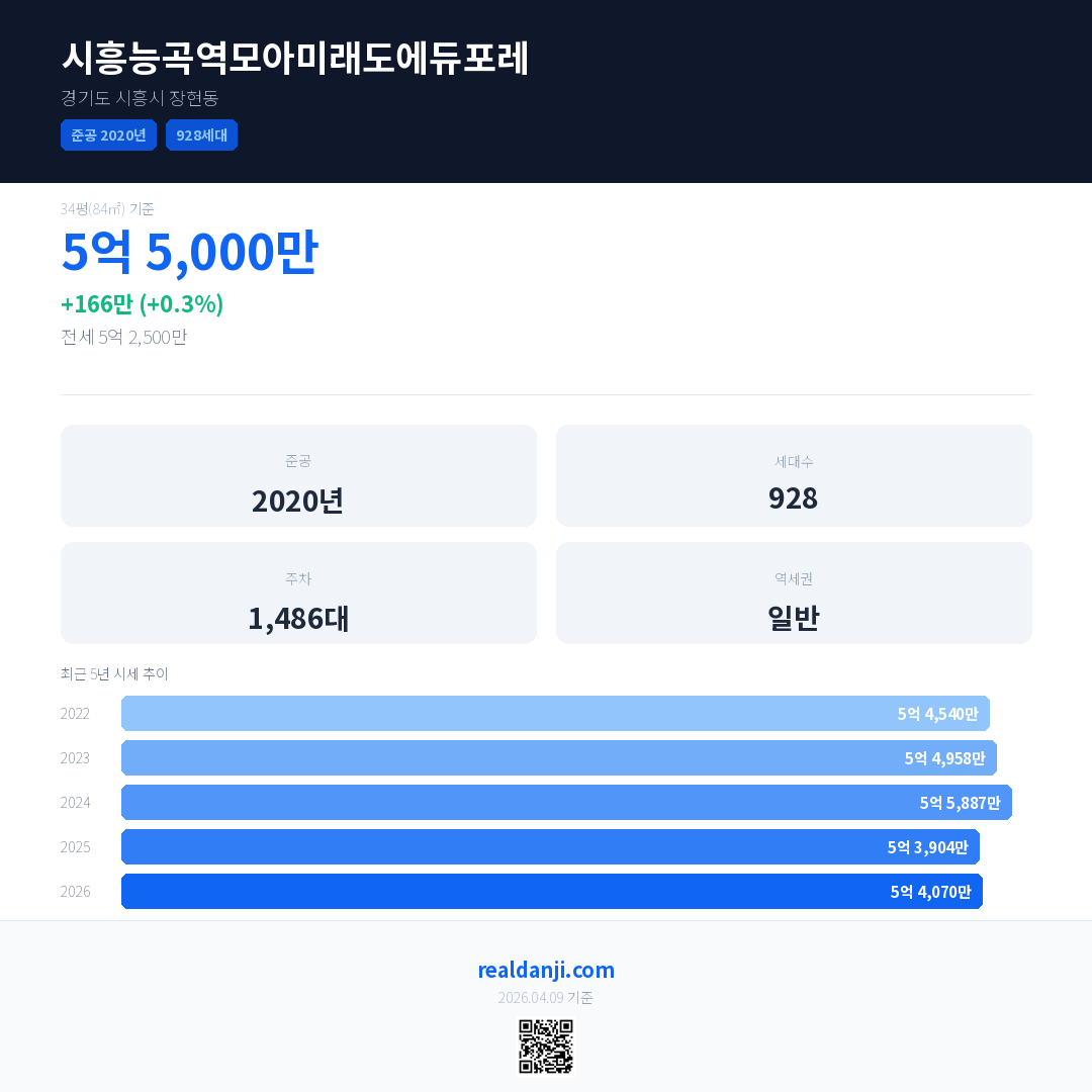 시흥능곡역모아미래도에듀포레 국민평형 기준 2026년 평균 거래가는 5억 4,070만으로, 전년 대비 0.3% 상승 했습니다.