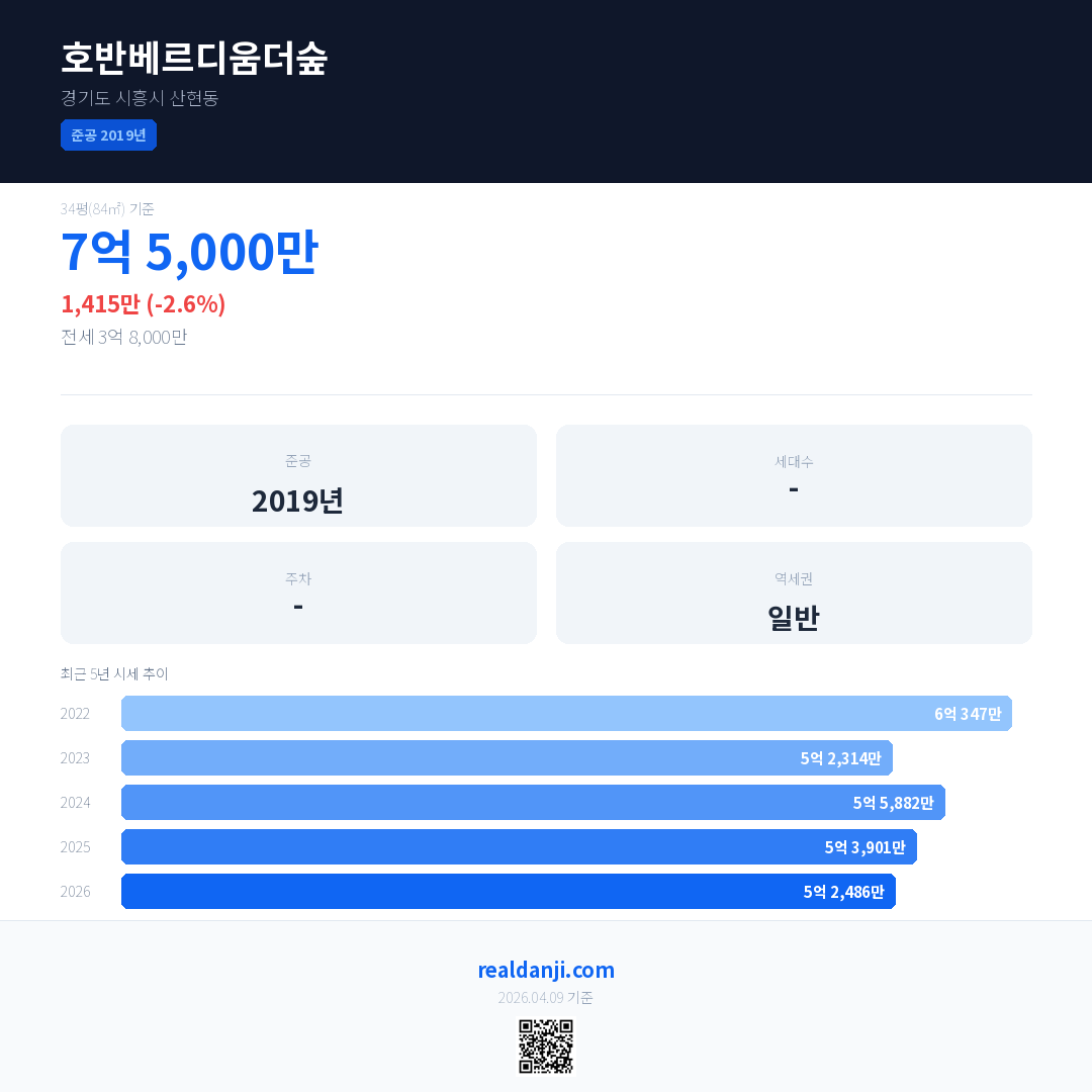 호반베르디움더숲 국민평형 기준 2026년 평균 거래가는 5억 2,486만으로, 전년 대비 2.6% 하락 했습니다.