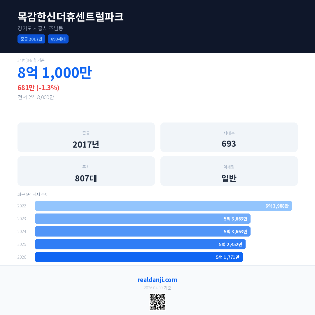 목감한신더휴센트럴파크 국민평형 기준 2026년 평균 거래가는 5억 1,771만으로, 전년 대비 1.3% 하락 했습니다.
