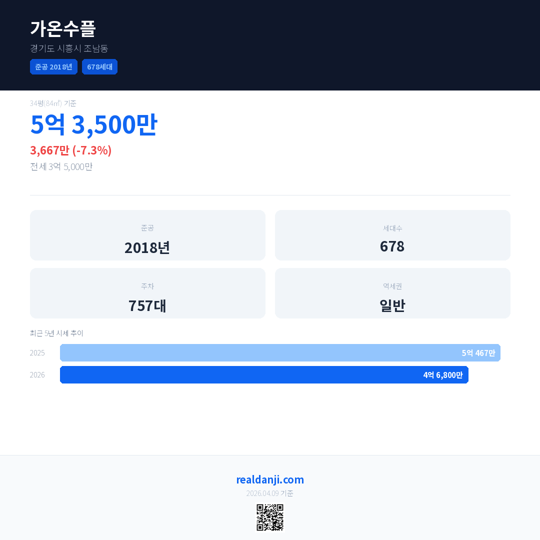 가온수플 국민평형 기준 2026년 평균 거래가는 4억 6,800만으로, 전년 대비 7.3% 하락 했습니다.