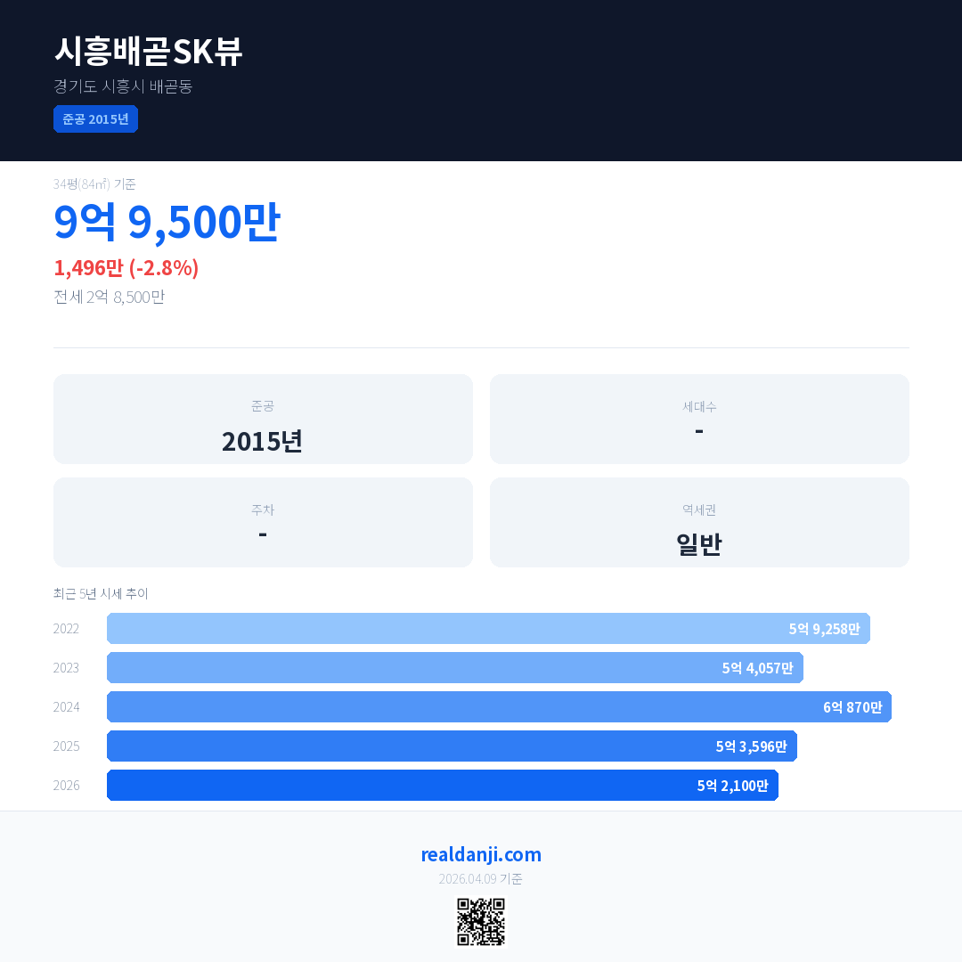 시흥배곧SK뷰 국민평형 기준 2026년 평균 거래가는 5억 2,100만으로, 전년 대비 2.8% 하락 했습니다.