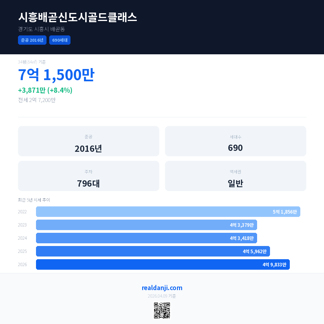 시흥배곧신도시골드클래스 최근 거래가는 7억 1,500만입니다. (2026-04)
