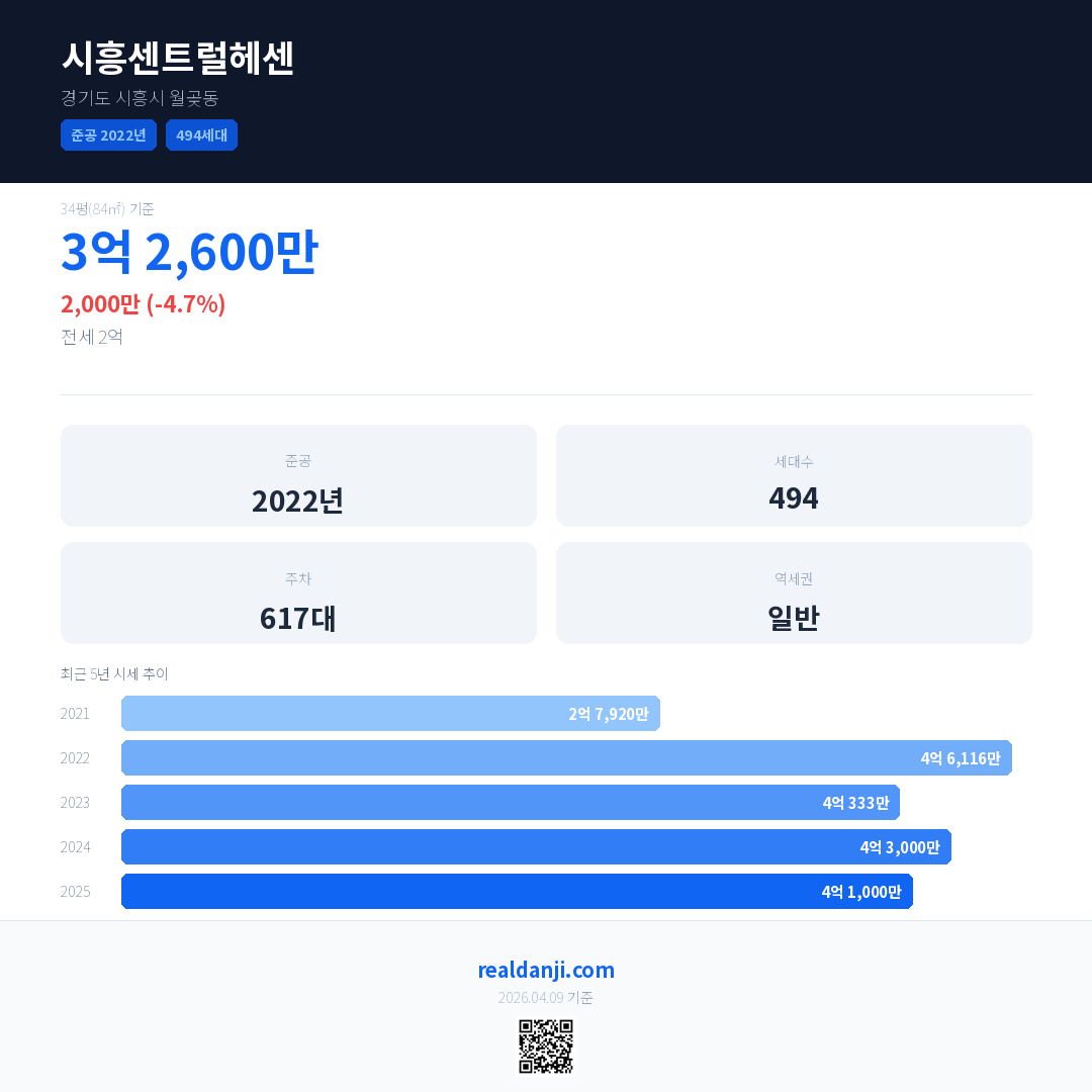 시흥센트럴헤센 국민평형 기준 2025년 평균 거래가는 4억 1,000만으로, 전년 대비 4.7% 하락 했습니다.