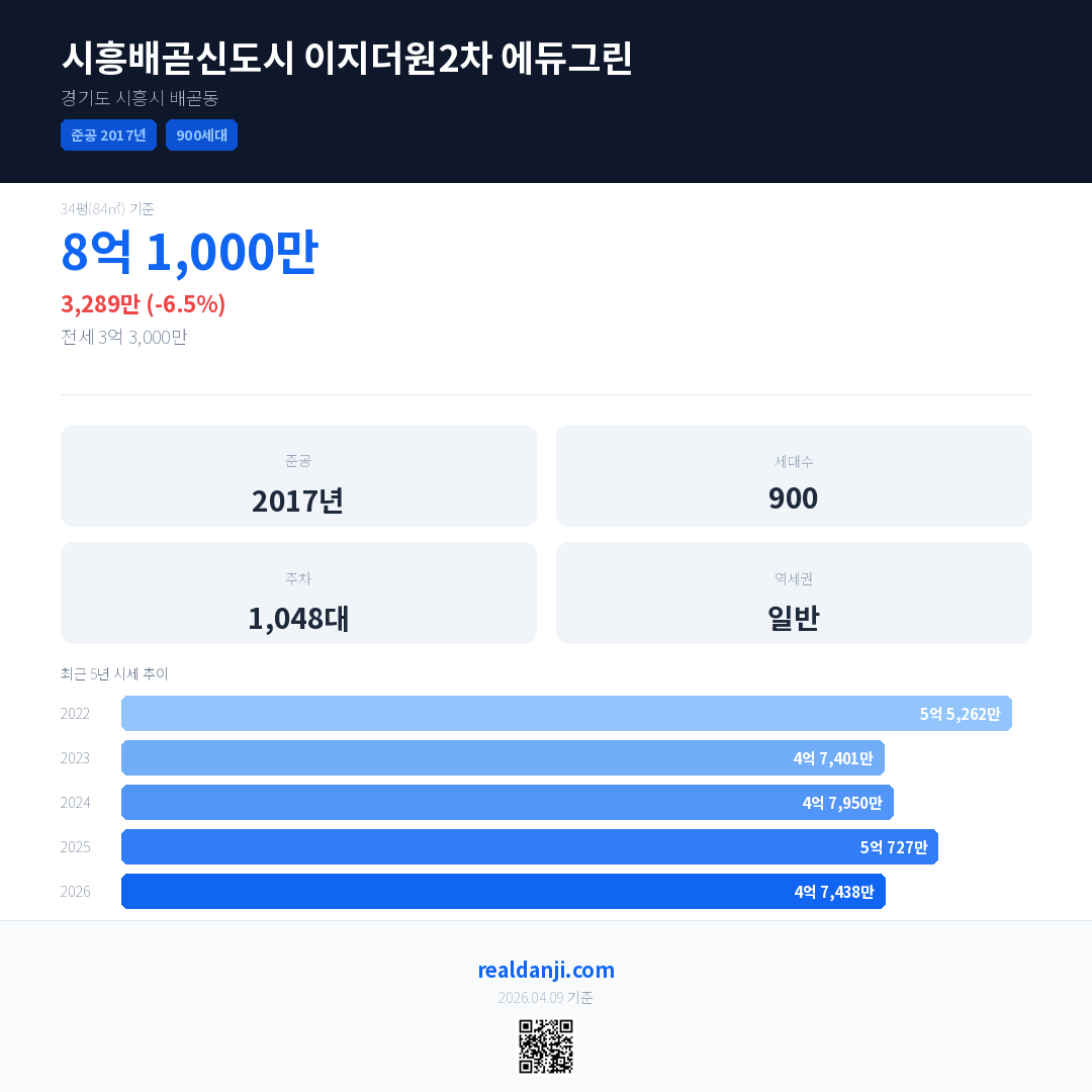 시흥배곧신도시 이지더원2차 에듀그린 최근 거래가는 8억 1,000만입니다. (2026-03)