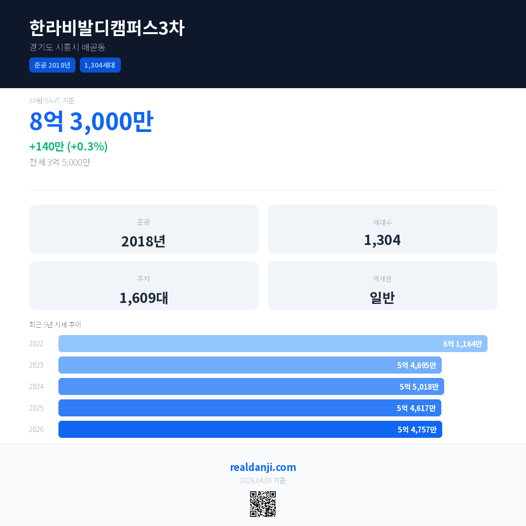 한라비발디캠퍼스3차 국민평형 기준 2026년 평균 거래가는 5억 4,757만으로, 전년 대비 0.3% 상승 했습니다.