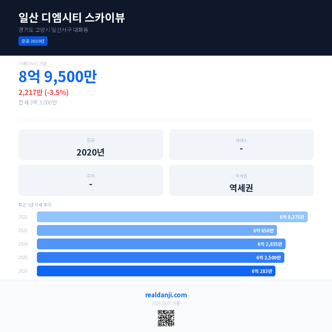 일산 디엠시티 스카이뷰 국민평형 기준 2026년 평균 거래가는 6억 283만으로, 전년 대비 3.5% 하락 했습니다.
