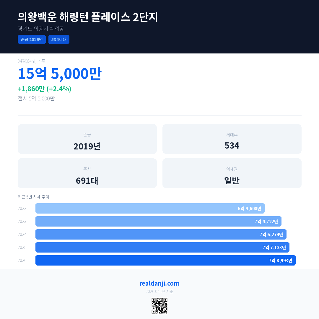 의왕백운 해링턴 플레이스 2단지 최근 거래가는 15억 5,000만입니다. (2026-03)