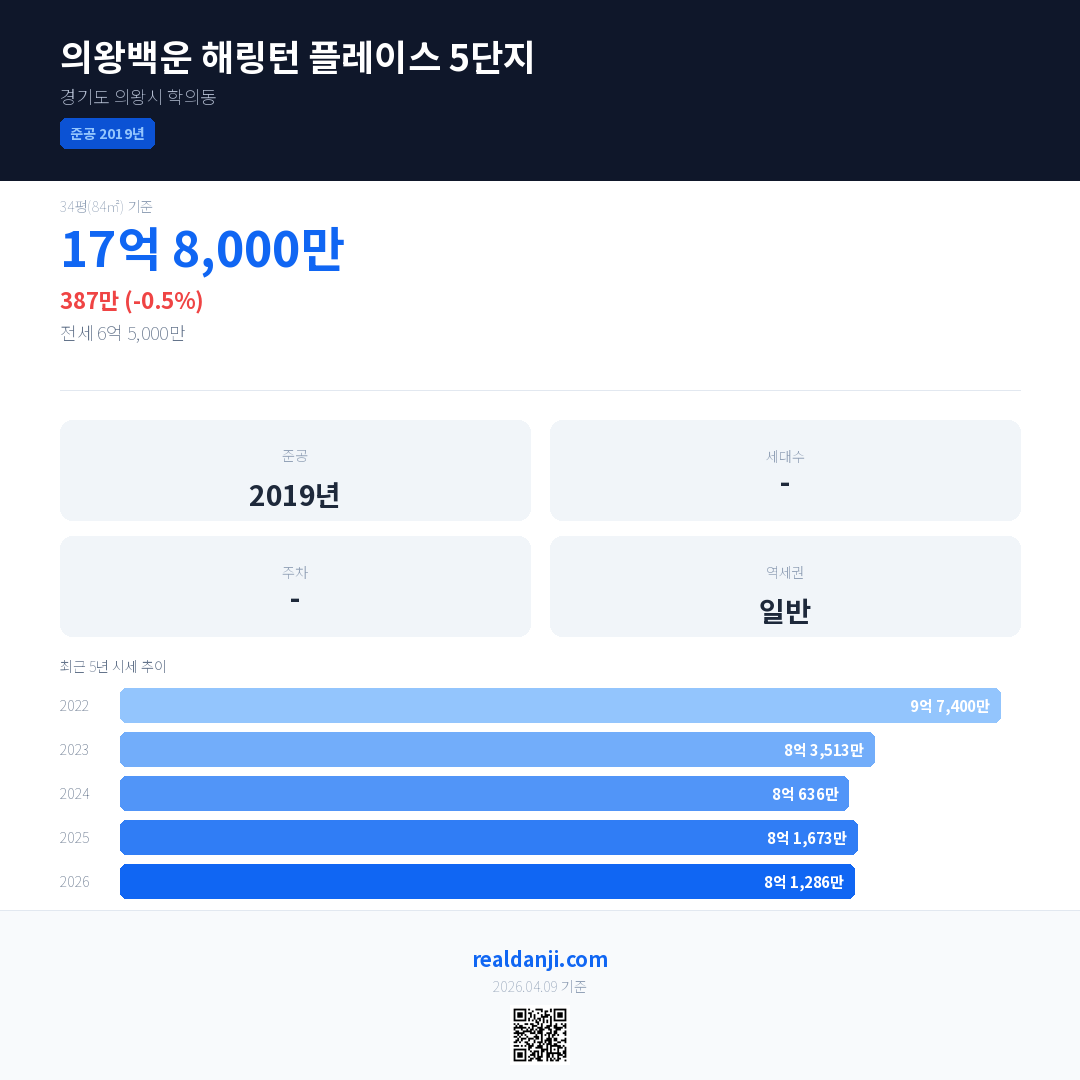 의왕백운 해링턴 플레이스 5단지 국민평형 기준 2026년 평균 거래가는 8억 1,286만으로, 전년 대비 0.5% 하락 했습니다.