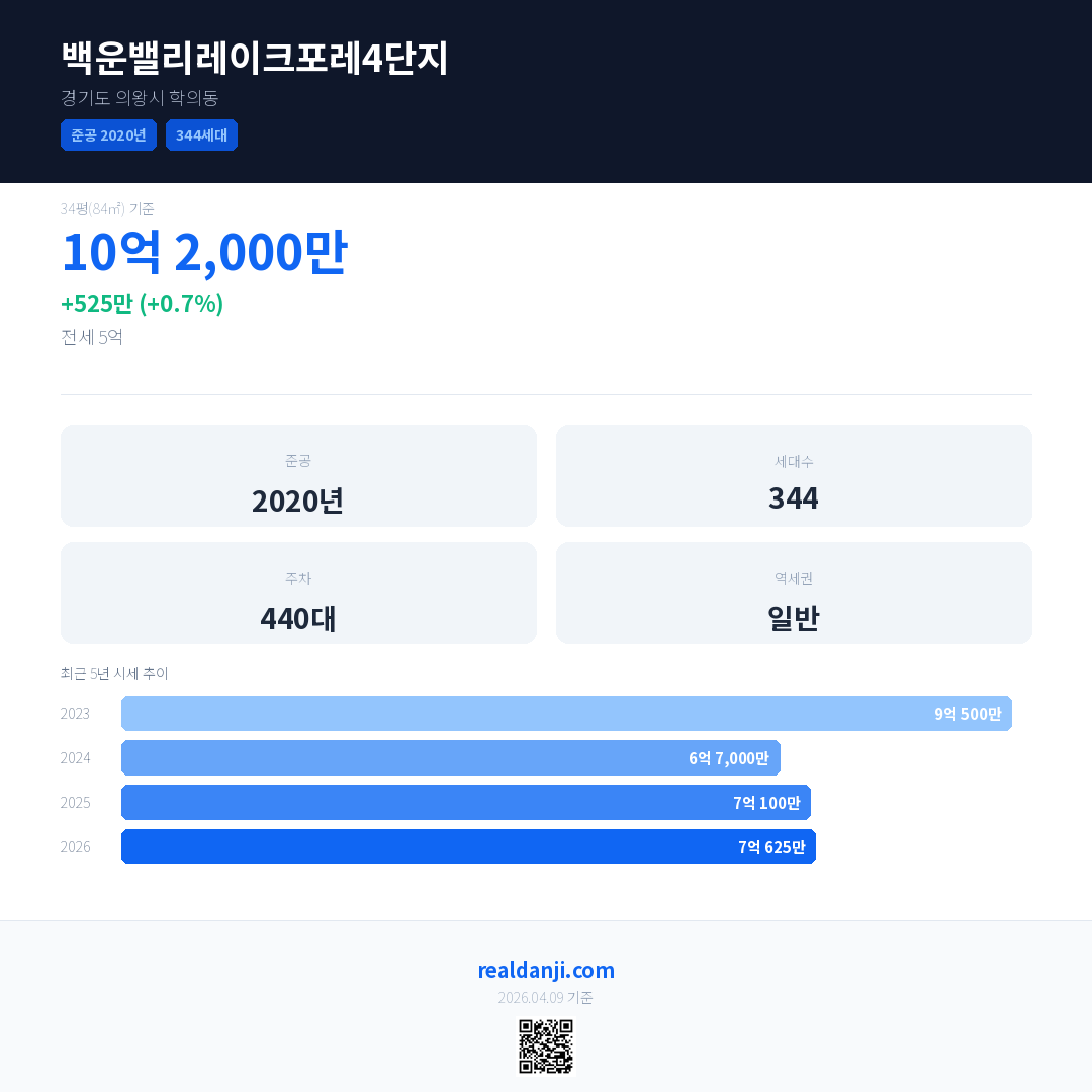 백운밸리레이크포레4단지 최근 거래가는 10억 2,000만입니다. (2026-03)