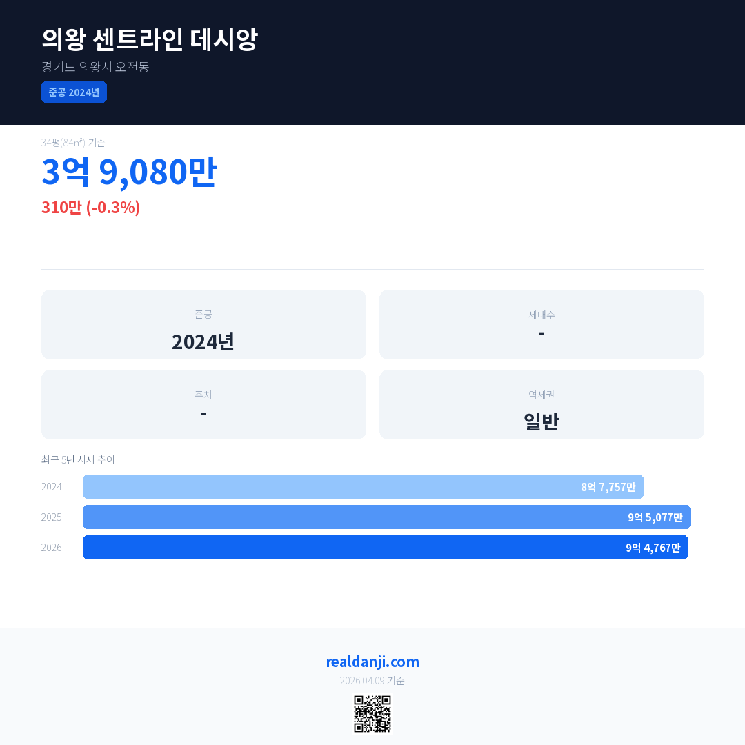 의왕 센트라인 데시앙 국민평형 기준 2026년 평균 거래가는 9억 4,767만으로, 전년 대비 0.3% 하락 했습니다.
