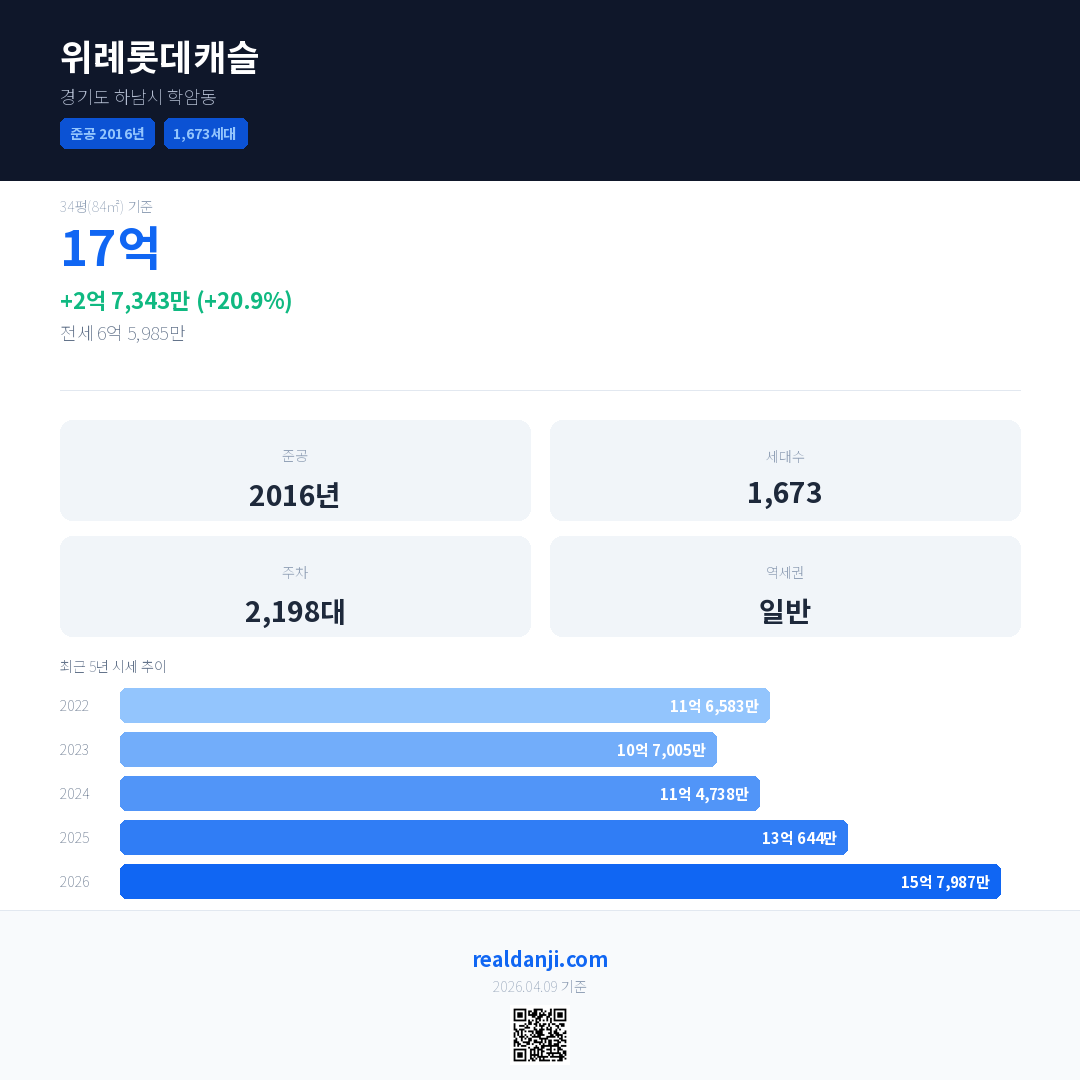 위례롯데캐슬은(는) 2016년에 준공되었으며, 현재 10년차입니다. 총 1,673세대 규모입니다.