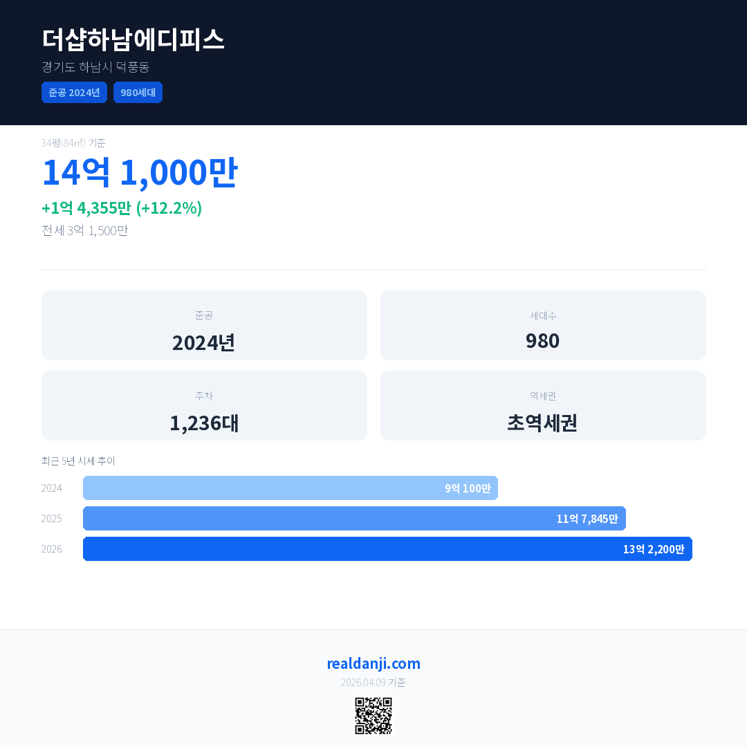 더샵하남에디피스 국민평형 기준 2026년 평균 거래가는 13억 2,200만으로, 전년 대비 12.2% 상승 했습니다.