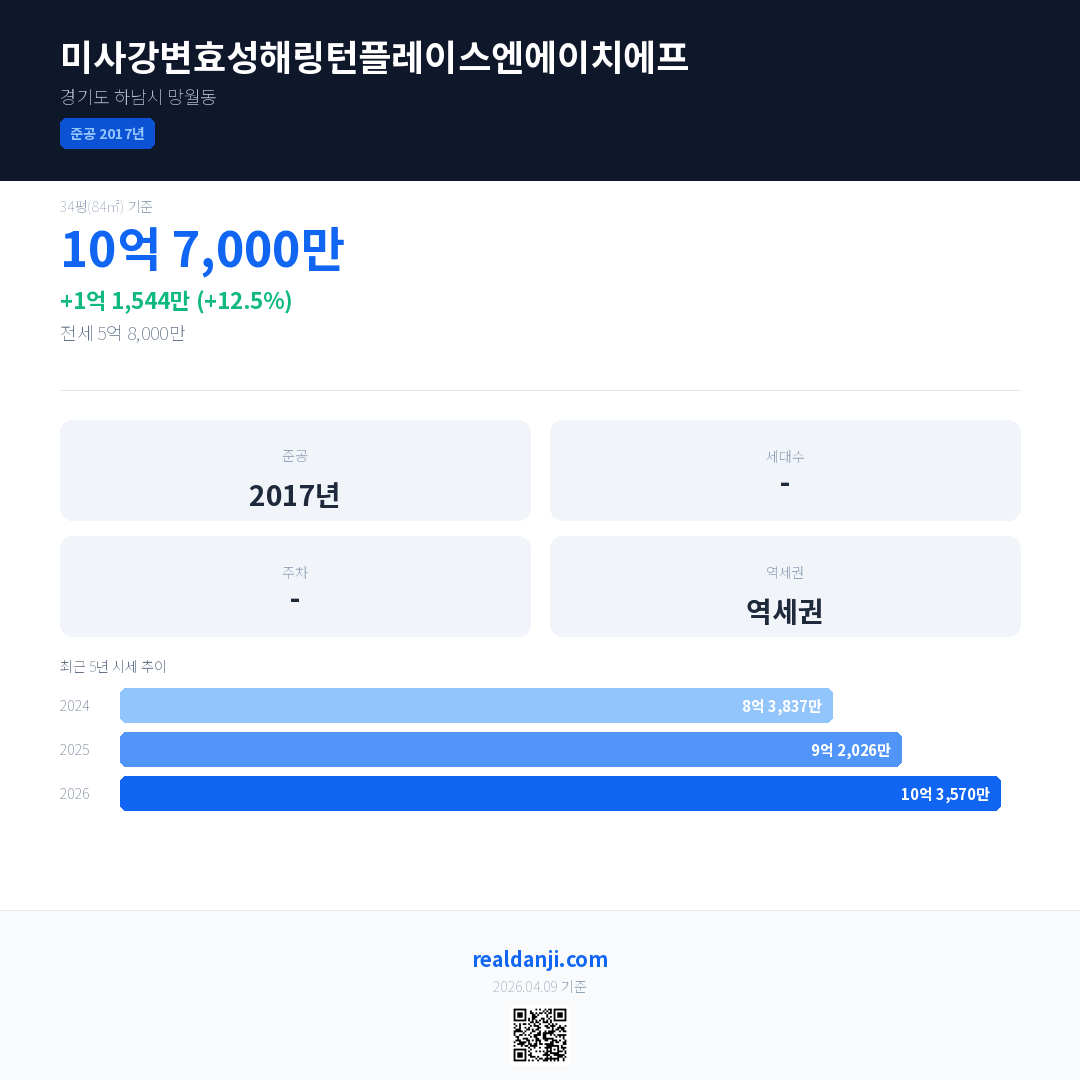 미사강변효성해링턴플레이스엔에이치에프 최근 거래가는 10억 7,000만입니다. (2026-04)