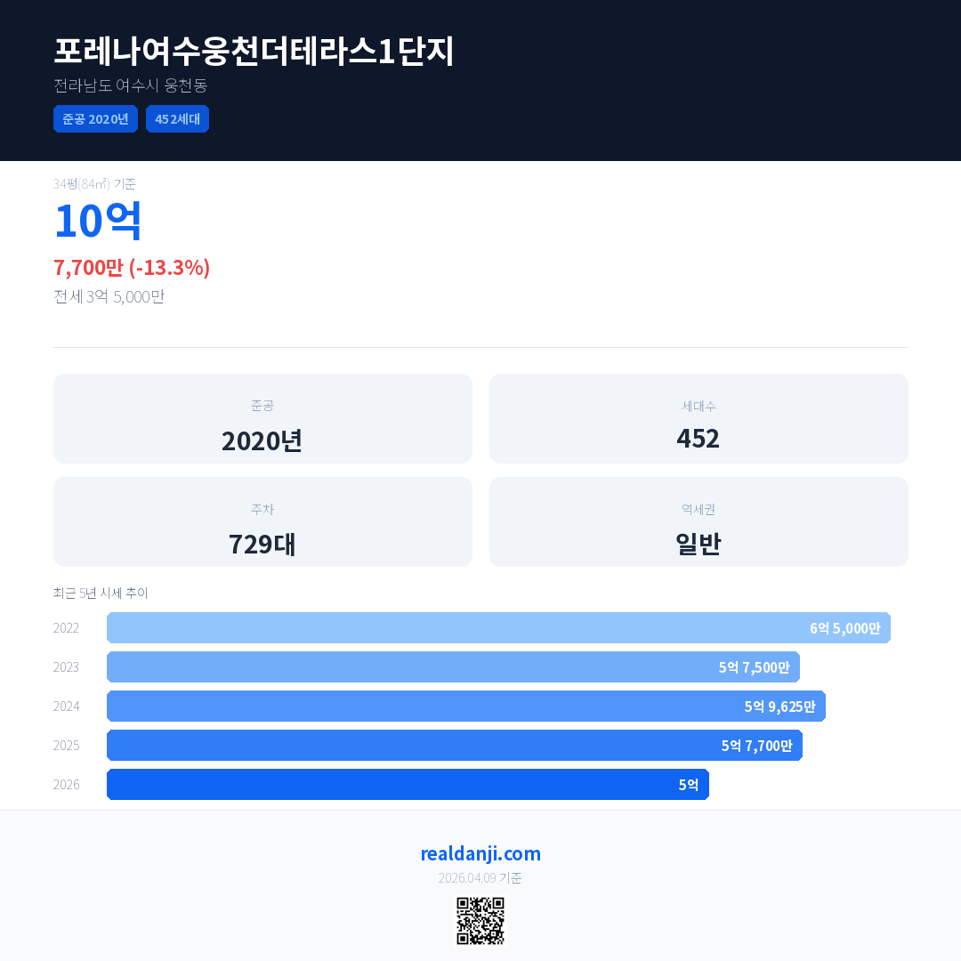 포레나여수웅천더테라스1단지 최근 거래가는 5억입니다. (2026-02)