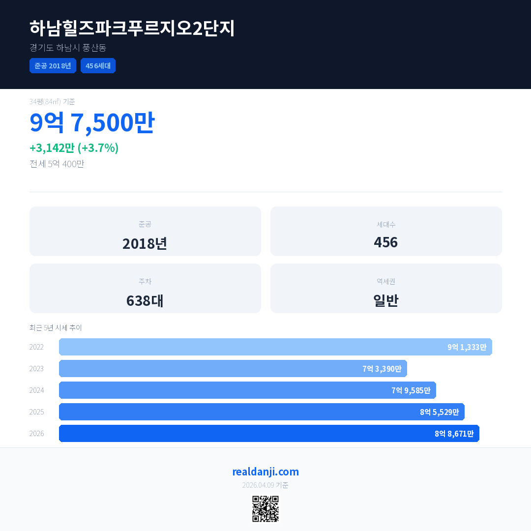 하남힐즈파크푸르지오2단지은(는) 2018년에 준공되었으며, 현재 8년차입니다. 총 456세대 규모입니다.