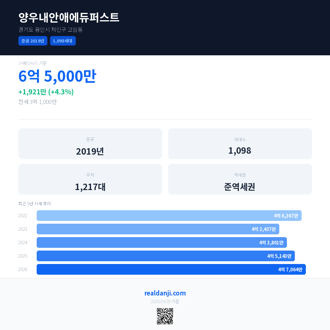 양우내안애에듀퍼스트 국민평형 기준 2026년 평균 거래가는 4억 7,064만으로, 전년 대비 4.3% 상승 했습니다.