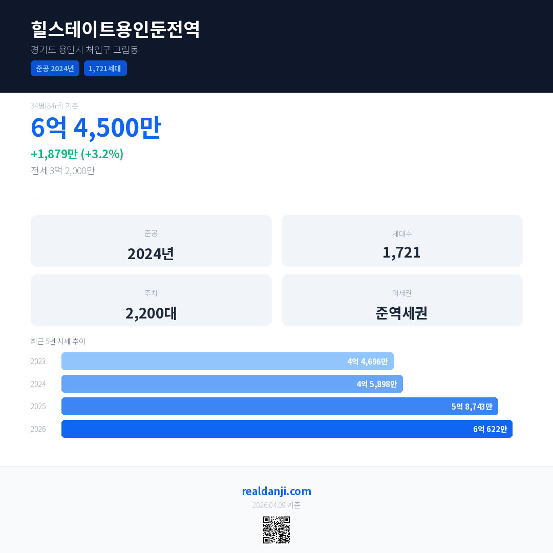 힐스테이트용인둔전역 최근 거래가는 6억 4,500만입니다. (2026-03)