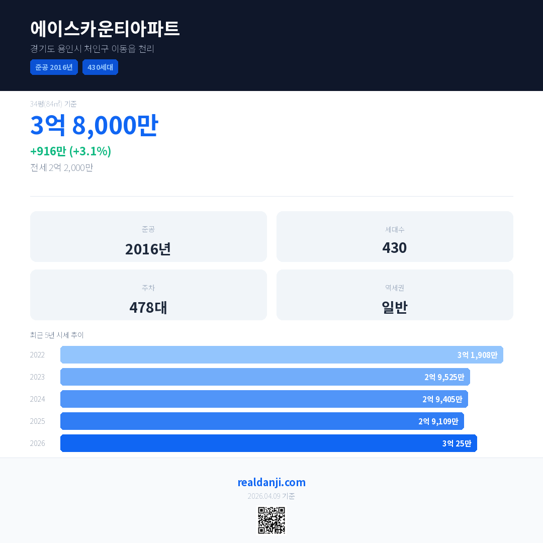에이스카운티아파트은(는) 2016년에 준공되었으며, 현재 10년차입니다. 총 430세대 규모입니다.
