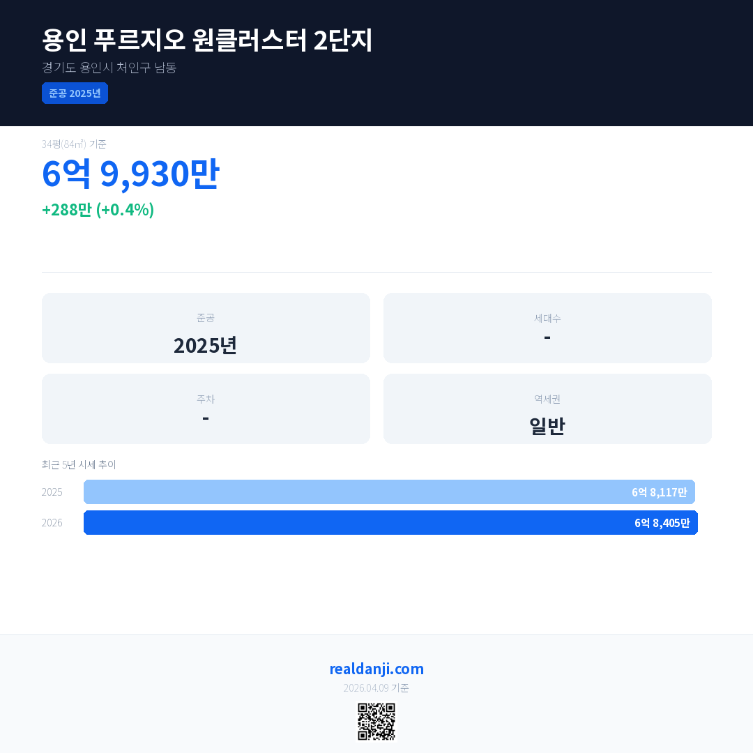 용인 푸르지오 원클러스터 2단지 국민평형 기준 2026년 평균 거래가는 6억 8,405만으로, 전년 대비 0.4% 상승 했습니다.