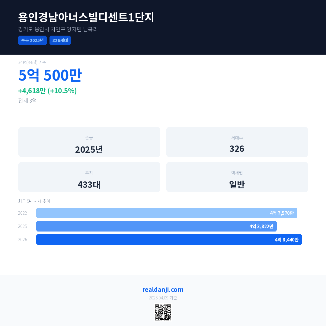 용인경남아너스빌디센트1단지 국민평형 기준 2026년 평균 거래가는 4억 8,440만으로, 전년 대비 10.5% 상승 했습니다.
