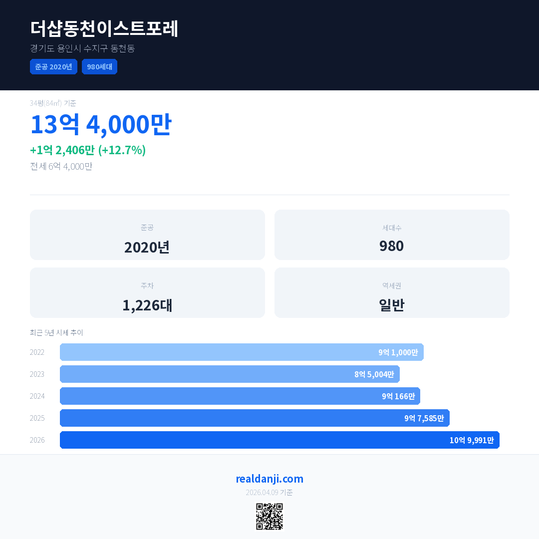 더샵동천이스트포레 최근 거래가는 13억 4,000만입니다. (2026-03)