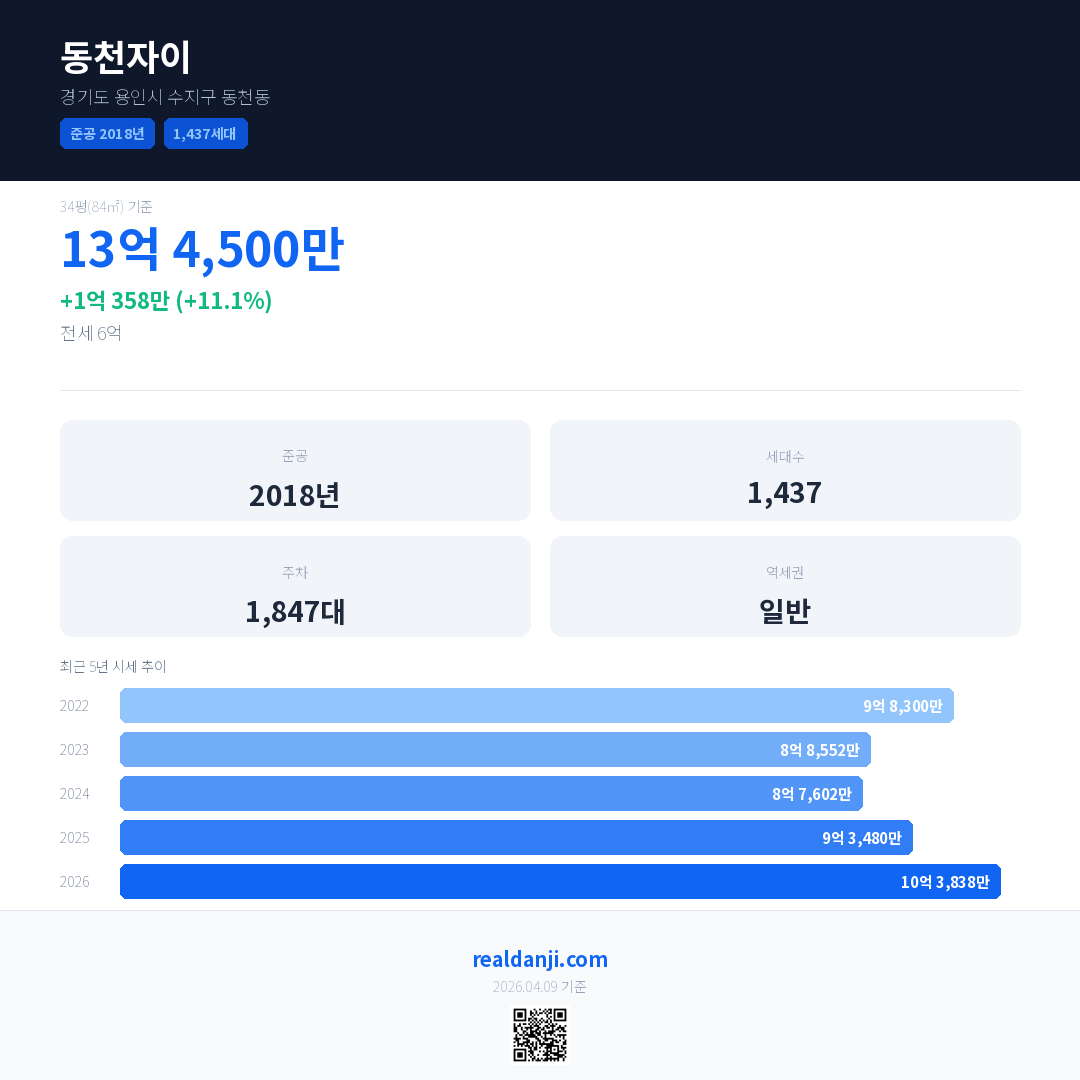 동천자이 국민평형 기준 2026년 평균 거래가는 10억 3,838만으로, 전년 대비 11.1% 상승 했습니다.