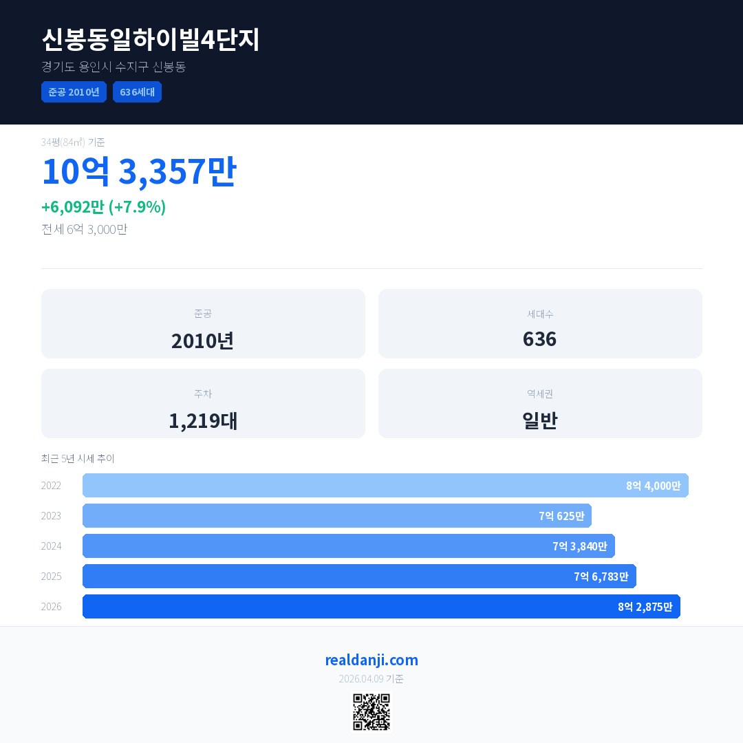신봉동일하이빌4단지 최근 거래가는 10억 3,357만입니다. (2026-03)